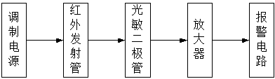 用紅外發(fā)射二極管組成發(fā)射系統(tǒng),在發(fā)射和接收系統(tǒng)之間有紅光束警戒線。當(dāng)警戒線