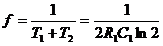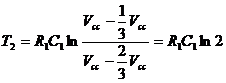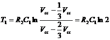 而在后半周期,電容放電時,二極管反向電阻無窮大,555內(nèi)部的三極導(dǎo)通,電流通過R1至7腳直接放電,此時其放電時間T2為: