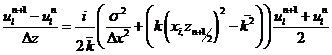 表示第n個縱向平面上的第i個橫向柵格點處的場分布,并且縱向平面之間的間隔和橫向柵格點之間的間隔分別為Δz和Δx。根據(jù)Grank-Nicholson 方法,在波導縱向已知的第n個平面和未知的第n+1個平面之間的中央平面上式 (4)可表示為