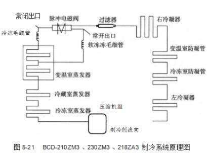 2)當(dāng)位于上梁左側(cè)的帶指示燈的轉(zhuǎn)換開頭撥向“冷凍一邊時(shí),此時(shí)脈沖鬧得電脈沖間換向,常閉口與過濾器端接通,制冷劑流向?yàn)樽罄淠?rarr;冷凍防凝管→變溫室防凝管→右冷凝器→過濾器→脈沖閱→(紅色標(biāo)記的冷凍蒸發(fā)器毛細(xì)管)→變溫室圖5-21BCD-210ZM3、230ZM3、218ZA3制冷系統(tǒng)原理圖(冷凍)蒸發(fā)器→冷藏室蒸發(fā)器→冷凍室蒸發(fā)器→壓縮機(jī)